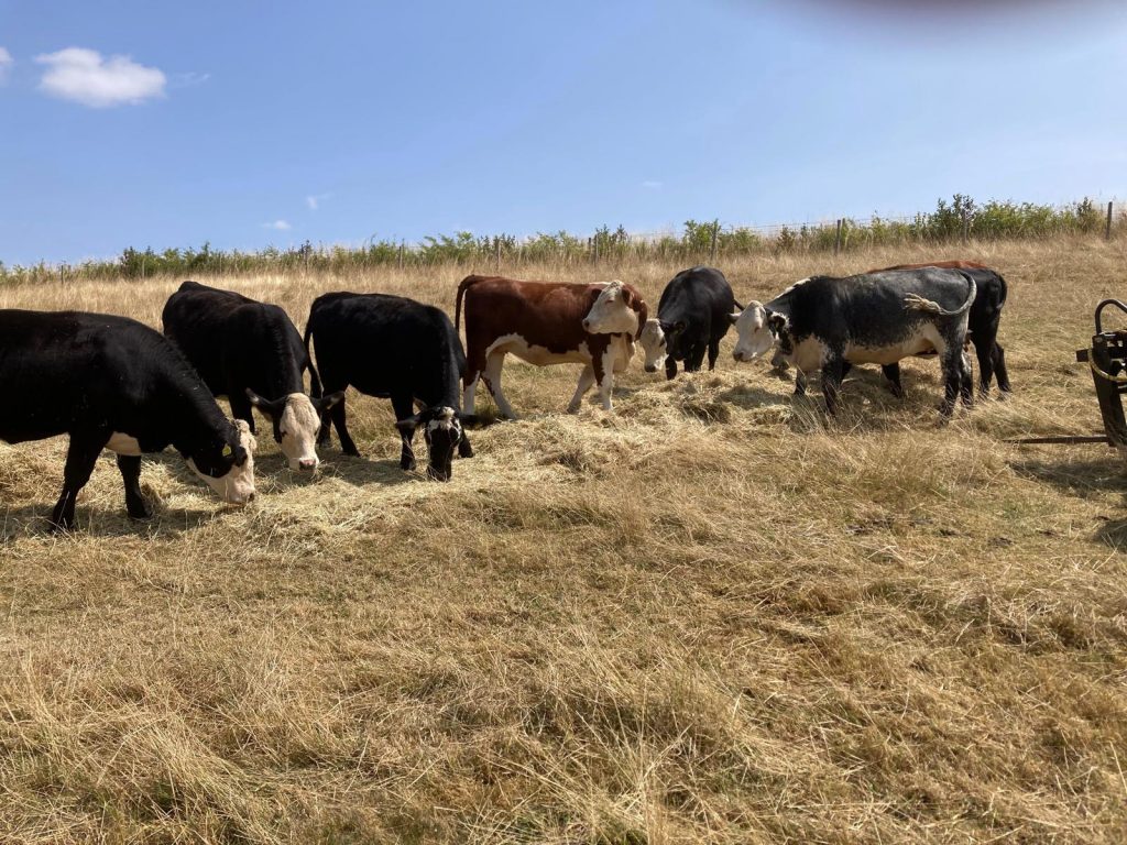 Here are our in-calf heifers tucking into some of our valuable winter hay supply, two groups have been munching through this, while the other groups survive on meagre pickings across the herbal leys, which seem more tolerant of drought than the shrivelled permanent pastures, which give up all too quickly.