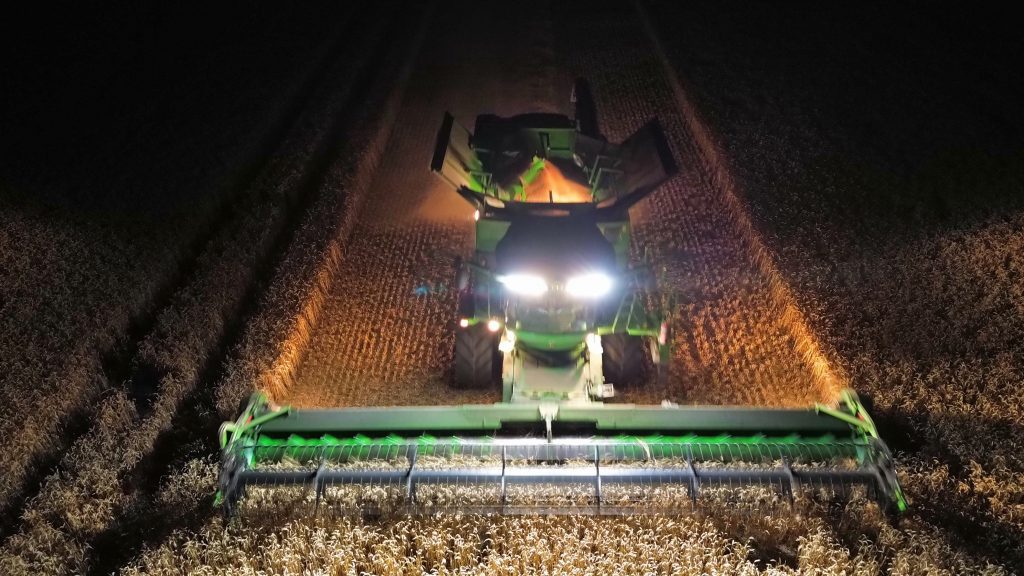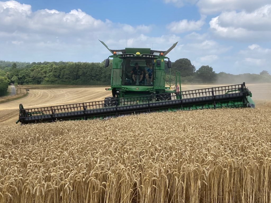 Will at the helm, the combine here is demonstrating its self-levelling ability.  This is a John Deere speciality, other manufacturers use different systems in an attempt to replicate this true levelling effect, such as by cleverly shaking the sieves so they throw the grain uphill to utilise the whole cleaning area.  An essential component of the combine’s thrashing system is to be able to separate the seed from the chaff, and if you can imagine using a sieve on an angle, the grain will simply fall to the lower side, reducing efficiency hugely.  The whole body staying level allows the grain and trash to spread across the whole thrashing system, this allows even distribution of the flow of cleaning air.  Not only this, but it is far more comfortable for the driver than a fixed chassis machine.  It is old technology now, we bought our first self-levelling combine in 1994, and we are now on the 4th one since then, each one slightly larger than the previous, but we would not be without the self-levelling.  It is not available for combines on tracks, because the system relies on the ability of the machine to roll on the tyres as it changes angle, and flat tracks can’t do this.  Their advantages of lower ground pressure and superior grip on steep land do not in our estimation outweigh the ability to not spill your tea.