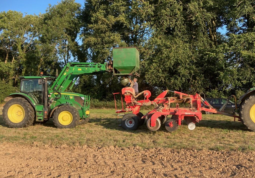 Gary pushing on with sowing cover crop into dust, using the seeder mounted on Heva discs. It looks a lot greener now.