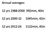 One last point on rainfall.  When someone asks whether I believe the climate is changing, I reply that I feel I cannot comment on something that needs measuring in centuries if not millennia.  Whereas the evidence of change in rainfall patterns in particular, over recent decades, does merit comment.  And if this is because of changes to the gulf stream and El Nino as a result of human activity, the burning of wood and fossil fuels in particular, then it is probably sensible to listen to the experts, and act accordingly.  Sad to say there seems little chance of this happening any time soon.  Anyway, this little chart shows that over the three chunks of 12 years that make up most of our rain recording period since the mid 80s, average annual rainfall in our corner of Dorset has indeed increased, by 12.5 percent over the 36 years.  One could argue about how best to calculate this, but whichever way you look at it, that is a significant increase.